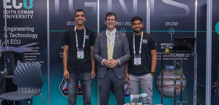 Image: ECU Executive Dean, School of Engineering Professor Paulo de Souza (centre) with Ibrahim Ali (L) and Khush Hirani (R) at the ECU stand at the Indo-Pacific Robotics, Autonomy, AI, Cyber Conference and Exhibition
